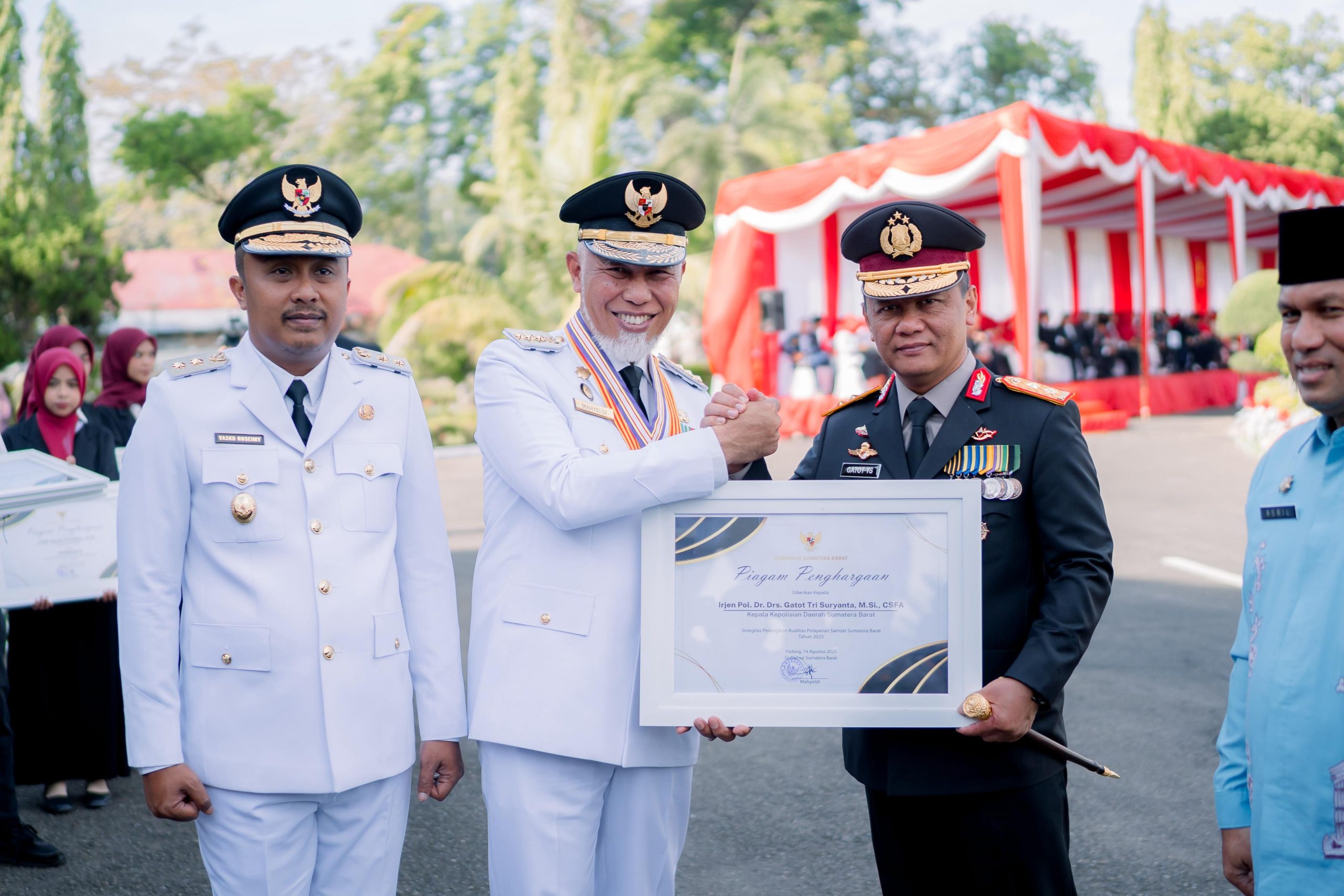 Selain mengikuti jalannya upacara bersama jajaran Forum Komunikasi Pimpinan Daerah (Forkopimda), Kapolda menerima penghargaan atas sinergitas Polda Sumbar dalam peningkatan kualitas pelayanan Samsat tahun 2025.